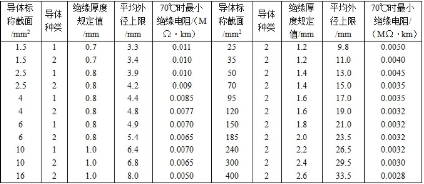 3)外形尺寸:電纜的平均外徑應(yīng)符合表1、表2的規(guī)定。