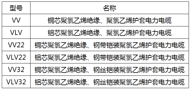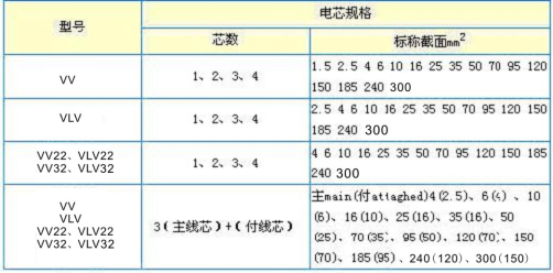 注:當電纜為4芯相等截面積結構時,最小規格的標稱截面積為1mm2,最大為400mm2